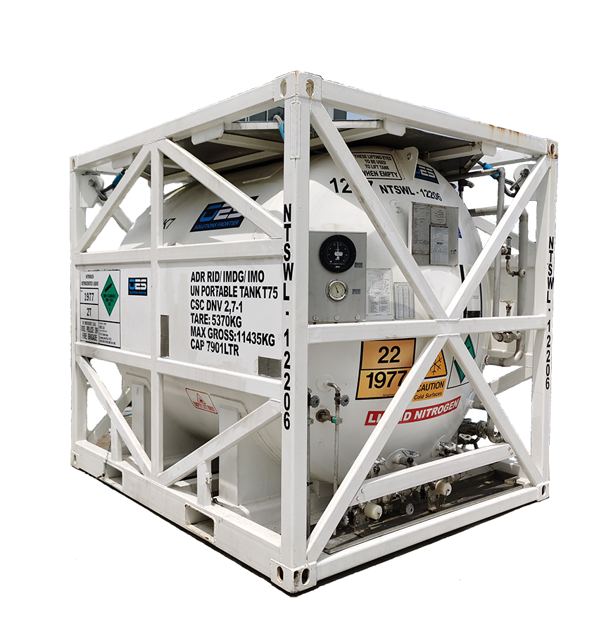 This T75 UN portable tank has approvals for road, rail & sea transport. It also has CSC, DNV 2.7-1 and ISO 10855 approvals among many other options, and is designed, manufactured / tested for storing and transporting liquid nitrogen and can often be seen on offshore supply vessels being transported to oil production platforms all over the world.